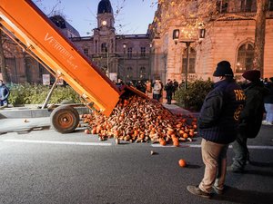 Après une journée à filtrer les camions à Garons, les agriculteurs en colère ont été reçus à la préfecture de Nîmes, devant laquelle ils ont déversé des remorques de citrouilles et de patates douces.